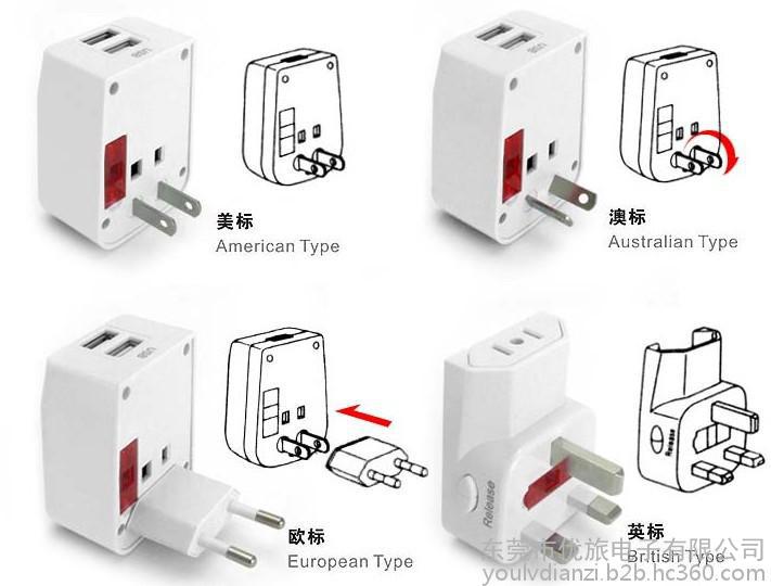 2、双扁插脚部分,可随意旋转成平行或八字型(即:旋转成中、日、美式,或澳式插脚)。