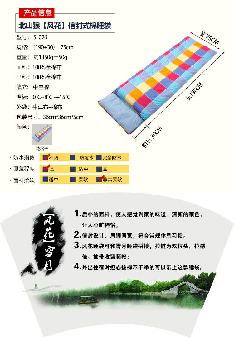 本网页所展示的有关【北山狼户外全棉保暖睡袋 成人睡袋 野营午休睡袋 风花SL026_睡袋_浙江省丽水市农产品有限公司】的信息/图片/参数等由简塑制品网的会员【浙江省丽水市农产品有限公司】提供,由简塑制品网会员【浙江省丽水市农产品有限公司】自行对信息/图片/参数等的真实性、准确性和合法性负责,本平台(本网站)仅提供展示服务,请谨慎交易,因交易而产生的法律关系及法律纠纷由您自行协商解决,本平台(本网站)对此不承担任何责任。您在本网页可以浏览【北山狼户外全棉保暖睡袋 成人睡袋 野营午休睡袋 风花SL026_睡袋_浙江省丽水市农产品有限公司】有关的信息/图片/价格等及提供【北山狼户外全棉保暖睡袋 成人睡袋 野营午休睡袋 风花SL026_睡袋_浙江省丽水市农产品有限公司】的商家公司简介、联系方式等信息。